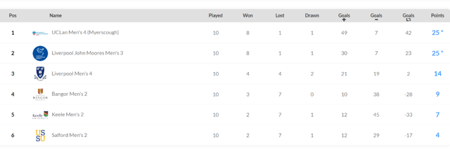 A very tight league this year saw Myerscough crowned champions on goal difference, just ahead of Liverpool John Moore’s University who fought all the way. The squad lost just once all season, and recorded fine victories, including scorelines of 9-2, 11-0 and even 16-0.